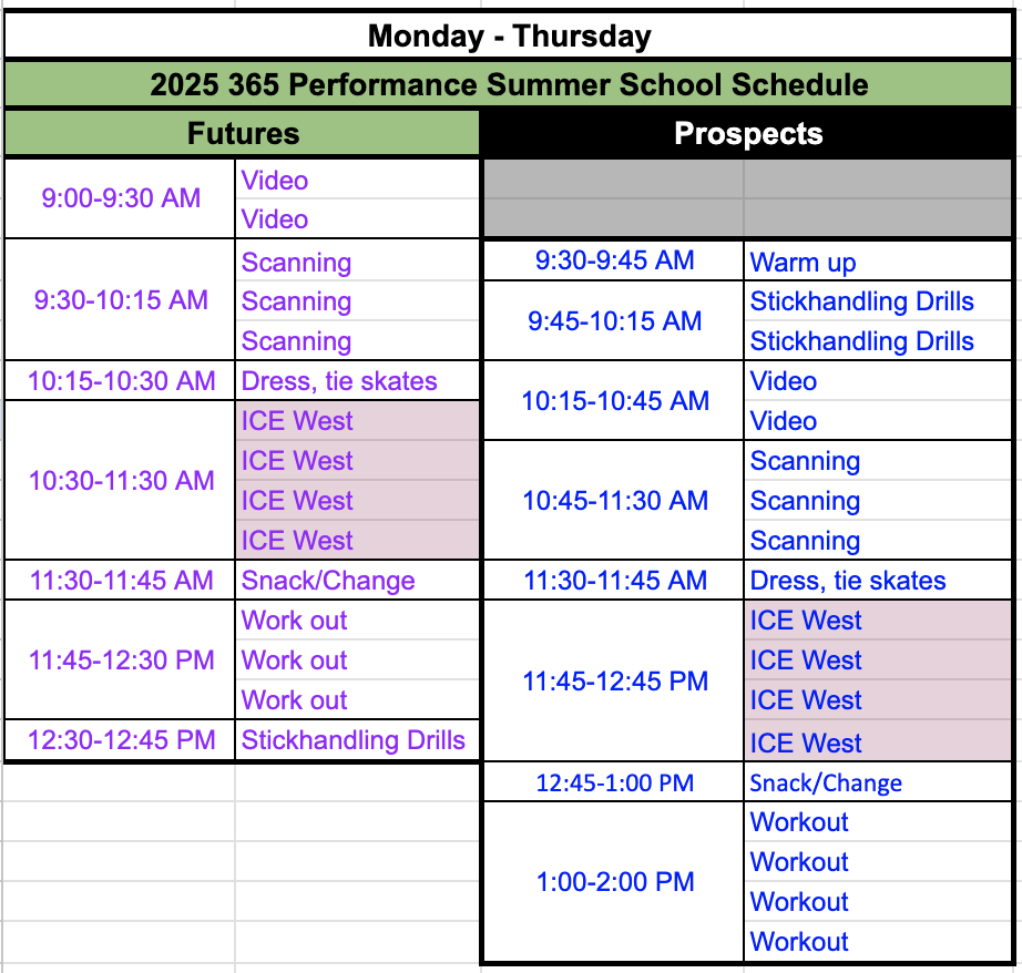 Players will participate in 4 ice sessions each week, 5x off-ice sessions (agility and scanning training) as well as 5x gym workouts: